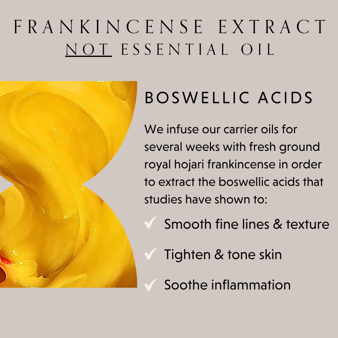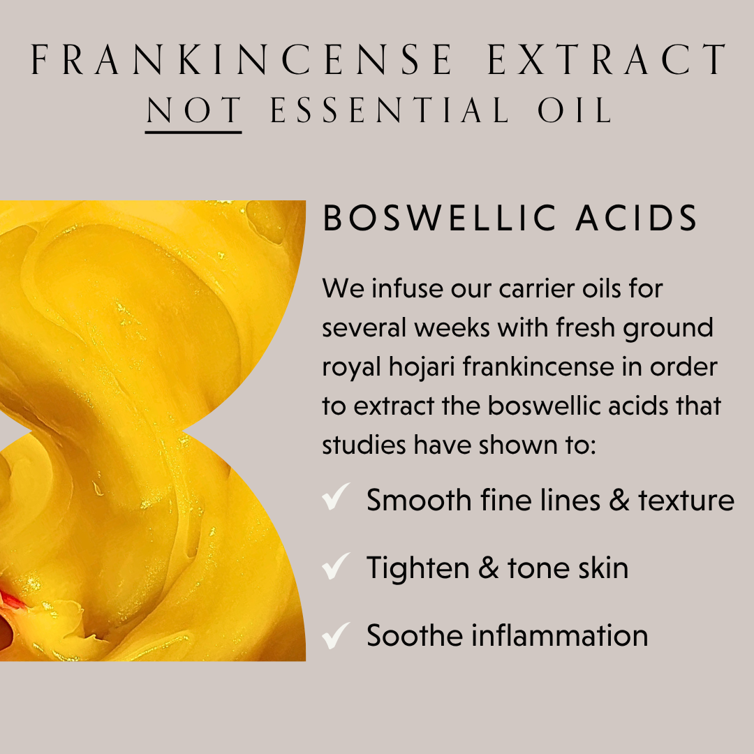 We prefer to extract our frankincense using ancient techniques which is why we grind our frankincense fresh and infuse it into our botanical oils for weeks before straining. It's a much more expensive and involved method but once you experience the difference though you will never go back.